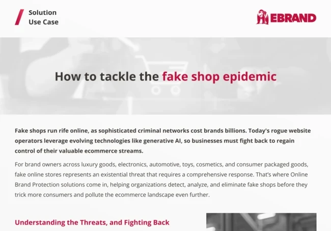 Let's uncover this trend with the latest stats and analysis from EBRAND experts. This free whitepaper delivers the latest stats and insights from across the fake shop battlefront online, leveraging expertise from digital analysts and brand protection professionals. It also details a recent case study from a cybercriminal network using CDNs (Content Distribution Networks) to spin up over 1,200 fake online stores to impersonate a luxury fashion brand.